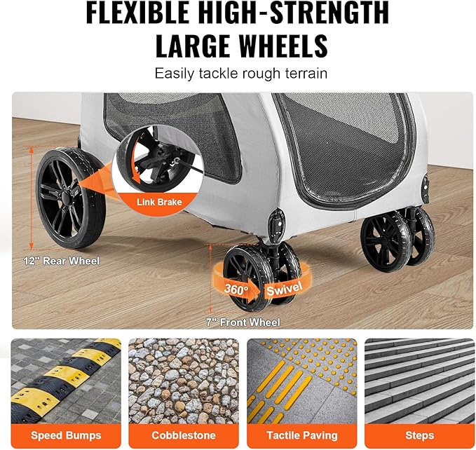 - Flexible Large Wheels: This dog stroller has EVA large wheels (7" front, 12" rear), ensuring a comfortable ride for your pet on any path. The 360° swivel front wheels provide easy maneuvering. The reliable link brake system ensures safety, making every outing with your furry friend enjoyable and convenient.