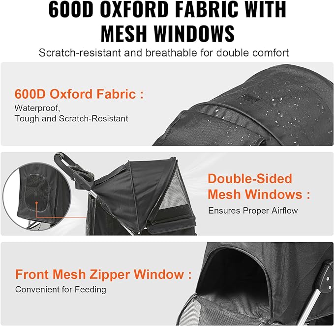 - DURABLE & STURDY MATERIAL: The structure of VEVOR pet stroller is made of superior aluminum alloy with rust-resistant powder coating, which is more durable and sturdy than normal steel frame. And this dog stroller is equipped with sturdy and water-resistant 600D oxford material, keeping the cat stroller in pristine condition.