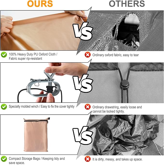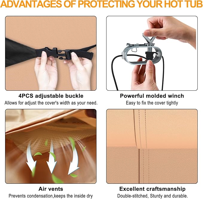 - 【Easy to Install and Fix】- The hot tub cover protector is easy to install without any tools and can be handled by one person. Our SPA cover with a specially molded winch which can turns smoothly and makes it easy to really tighten the cable. Premium adjustable slider buckles at both sides further ensure that the SPA cover is not blown away even in high winds and severe weather.