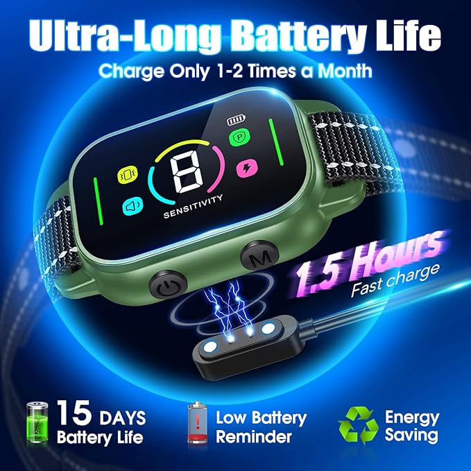 - ⚡1.5-Hour Fast Charging - Enjoy up to 15 days of battery life without frequent recharging. NHUJK Bark Collar for medium dogs features battery level display and low battery reminders for convenient usage. With an IP67 waterproof, anti bark device for dogs can be used indoors and outdoors, suitable for all occasions