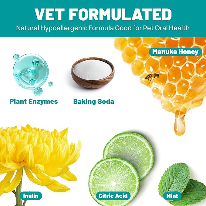 - Safe and Natural Ingredients: Our unique formula includes EDI purified water, plant enzymes, baking soda, tea polyphenols, inulin, Manuka honey, and citric acid. This innovative blend is alcohol-free, devoid of parabens and fragrances, making it safe even if licked or ingested. Perfect for pets with sensitive teeth, gums, and enamel.