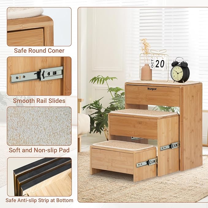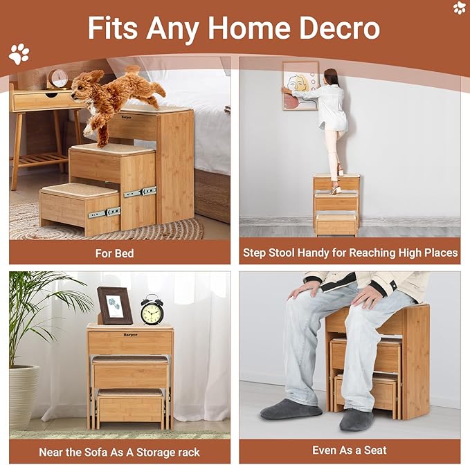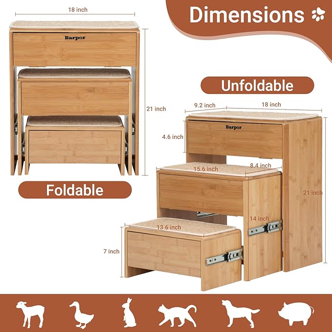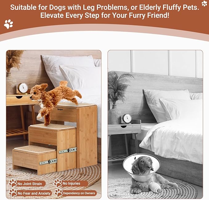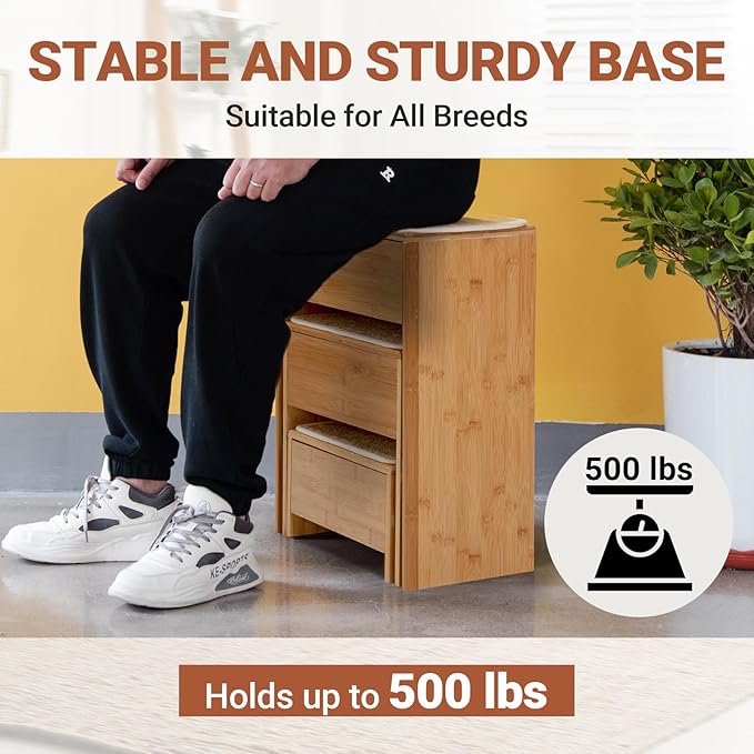 - Sturdy Construction & Non-Slip Surface: Built to last, these pet stairs are constructed from high-quality bamboo, providing a sturdy and reliable solution for pets up to 200 lbs. The steps are designed with a non-slip surface to ensure your furry friend can climb up and down safely and securely.