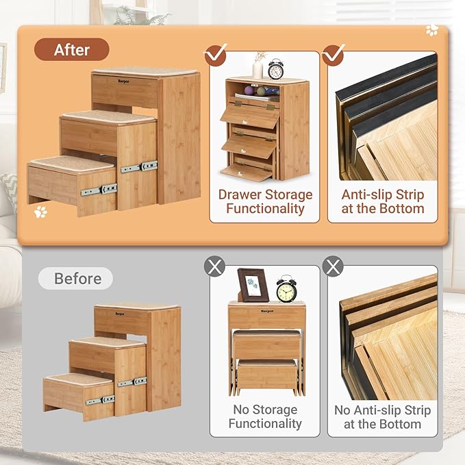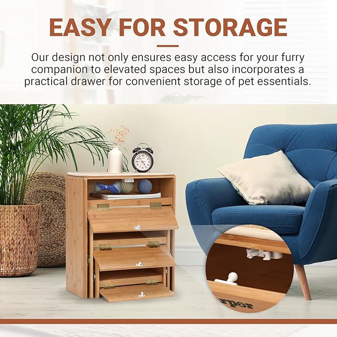 - Space-saving Design: Our bamboo pet stairs are uniquely crafted with a built-in storage compartment, offering a practical solution for storing pet accessories or other small items, keeping your space neat and organized.
