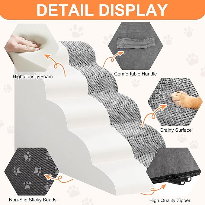 - HIGH DENSITY FOAM - Our dog steps are made of high-density foam, providing a comfortable and supportive surface for your furry friend to climb on. High-density foam is known for its excellent support capabilities. It offers firmness and stability, ensuring that your dog's weight is evenly distributed across the stairs. This helps to prevent any sagging or sinking, maintaining a reliable and sturdy surface for your pets.