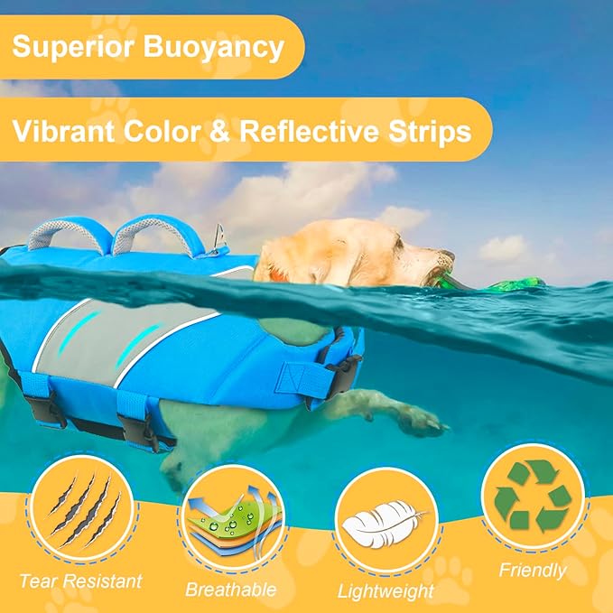 - 【 Superior Buoyancy 】 Crafted from tear-proof nylon and polyurethane foam, our dog swimming vest offers high buoyancy without restricting your dog's movement, keeping them safe and afloat in the water.