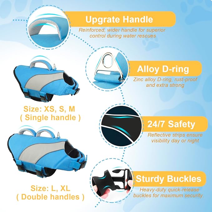 - 【 Reliable Rescue 】Featuring an alloy D-ring on the back and a widened, thickened rescue handle, this dog life jacket offers swift and secure assistance in emergencies, ensuring peace of mind for you and your pet.
