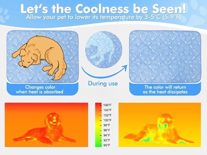 - 🐶【Interactive Cooling Visuals】Be amazed by the temperature-responsive surface! Our advanced thermochromic dog cooling mat changes color from deep blue to light as it absorbs heat and then returns to blue once cooled, creating an engaging visual display of the cooling process at work.This amazing feature not only looks cool, but it lets you witness the heat absorption and cooling process in action. Get one today and treat your furry friend to the ultimate cool and comfortable lounging experience!