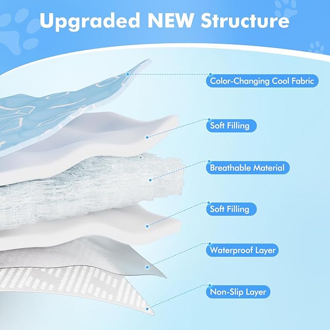 - 🐶【Interactive Cooling Visuals】Be amazed by the temperature-responsive surface! Our advanced thermochromic dog cooling mat changes color from deep blue to light as it absorbs heat and then returns to blue once cooled, creating an engaging visual display of the cooling process at work.This amazing feature not only looks cool, but it lets you witness the heat absorption and cooling process in action. Get one today and treat your furry friend to the ultimate cool and comfortable lounging experience!