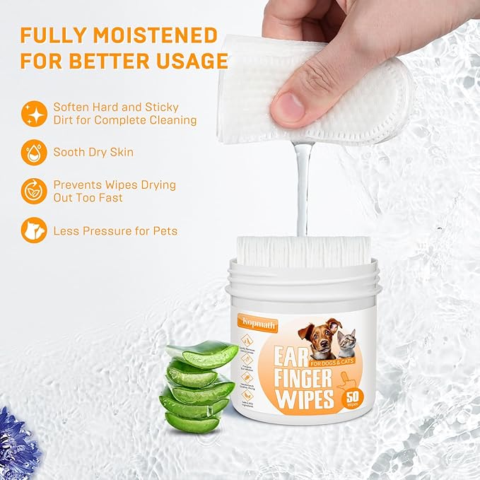 - Gently Clean and Deodorize Pet's Ears. Kopmath dog ear wipes finger are designed to effectively remove earwax, dirt and discharge deeper inside the ears without causing any discomfort. Regular use can prevent ear itching and irritation. Perfect for pets who resist any ear cleansing or those who hates ear drops and cotton swab.