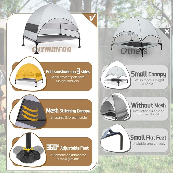 - 【CJYMMFAN Superior Stability with Unique Powerful Feet】: Our elevated dog bed boasts unique feet, which create a large contact area with the ground and feature a special bottom structure for exceptional grip. This innovative design enables the outdoor dog bed to stand much more stably than other pet beds, even on rugged terrain, such as beaches, hillsides, grass, and gravel.