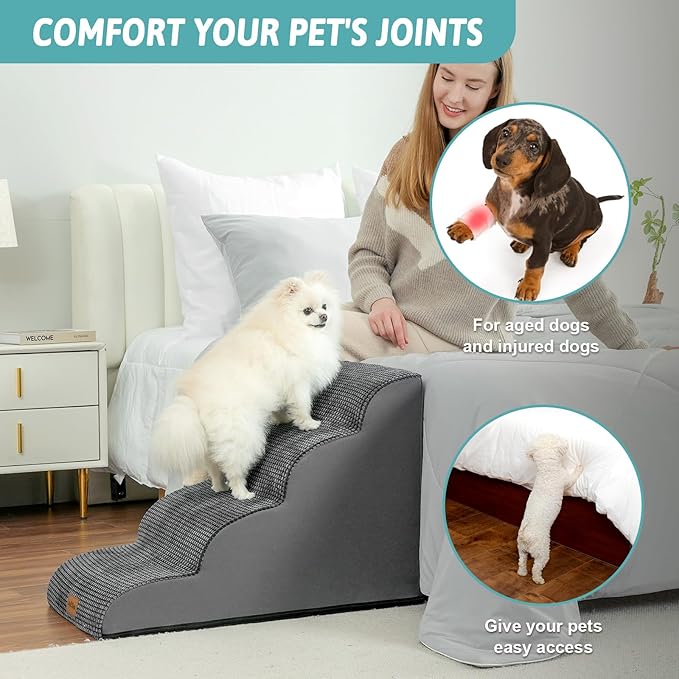 - 【NOTE & CHOOSE】NOTE: This STAIR IS NOT FOR LARGE DOG. NOTE: Please cover the cover before the sponge is completely fluffy to avoid being unable to cover. Please Note that the inner foam is not washable. 2 Tiers are suitable for Chair (11-16inches), 3 Tiers are suitable for Sofa or Couch (15-20 inches), 4 Tiers are suitable for bed (19-23 inches), 5 Tiers are suitable for High Bed or Car (22-28 inches)