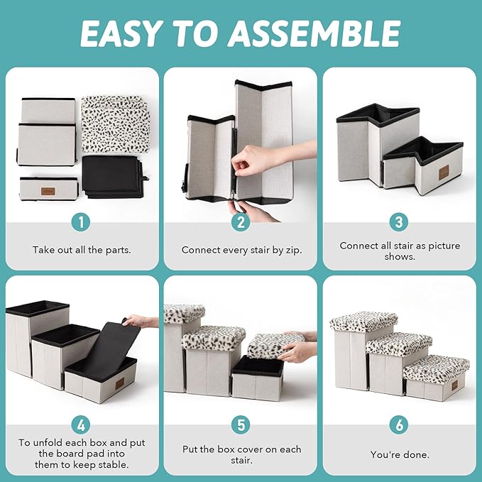- 【Easy to Assemble】First you need to connect the zipper of each step, then open each step completely, Place each support board in the corresponding storage box, and finally cover it. When you don't need it, remove the cover and store it after it is completely folded. This saves your space and is suitable for small rooms. You can also watch our installation video in the product description below.