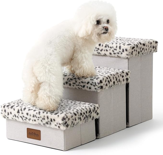 - 【Dog Stair with Storage】Each step has a useful storage space, perfect for storing pet toys, clothes, snacks and any other pet supplies and accessories you can think of. Each step of the ladder is less than 5 inches, especially more suitable for puppies and pets with knee injuries. NOTE: Be sure to check first whether the SIZE of the dog stairs is suitable for your needs.