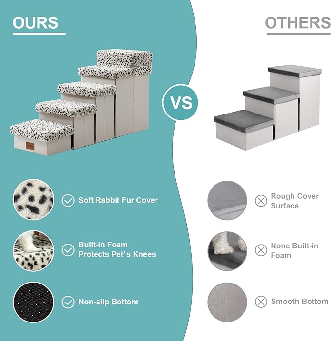 - 【Dog Stair with Storage】Each step has a useful storage space, perfect for storing pet toys, clothes, snacks and any other pet supplies and accessories you can think of. Each step of the ladder is less than 5 inches, especially more suitable for puppies and pets with knee injuries. NOTE: Be sure to check first whether the SIZE of the dog stairs is suitable for your needs.