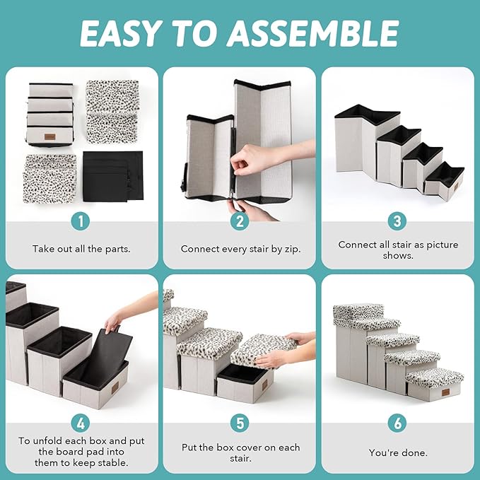 - 【Easy to Assemble】First you need to connect the zipper of each step, then open each step completely, Place each support board in the corresponding storage box, and finally cover it. When you don't need it, remove the cover and store it after it is completely folded. This saves your space and is suitable for small rooms. You can also watch our installation video in the product description below.