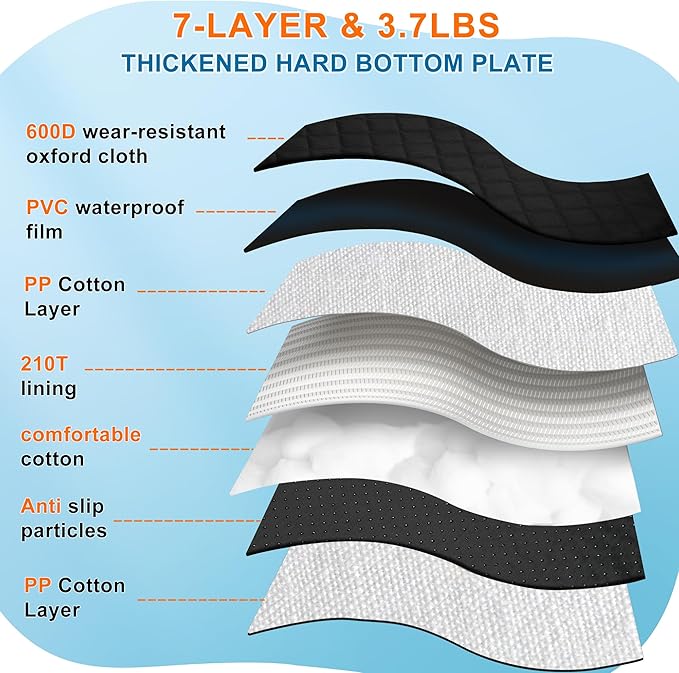 - 🐕︎ . Easy to install, skid-proof base, waterproof, easy to clean and store. Durable material: 600D thick, dense waterproof oxford fabric + polypropylene cotton + 210D fabric + skid-proof fabric + 6mm polypropylene board; besides, we provide one extra safety belt and two extra metal slings for free.