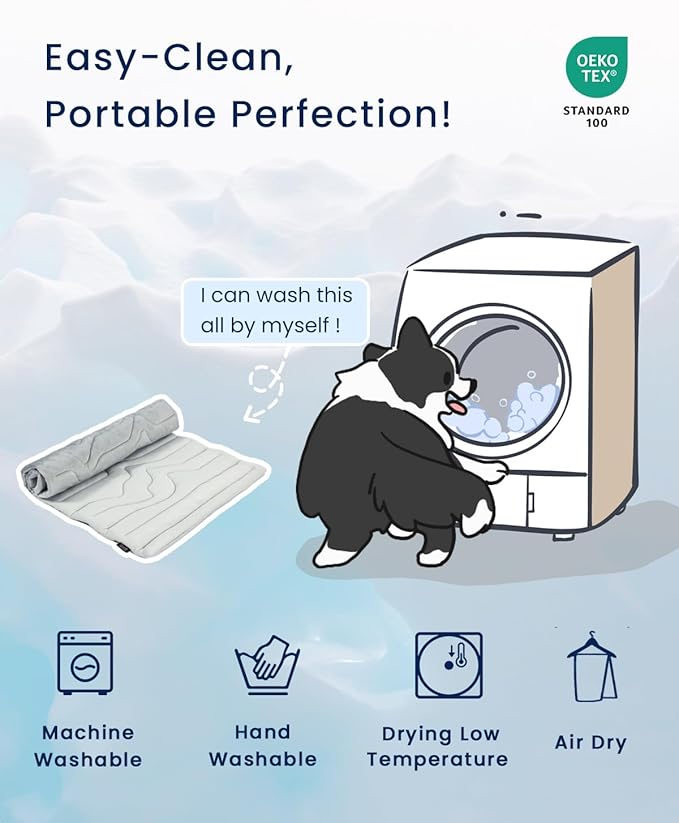 • EFFORTLESS MAINTENANCE, LASTING PERFORMANCE: Cleaning our dog cooling pad is a breeze. Simply toss it in the washing machine and air dry or dry it at low temperature for a quick refresh. Thanks to its durable construction, it withstands repeated washing cycles while maintaining its exceptional cooling performance. Enjoy peace of mind knowing your pet's comfort is always at its best