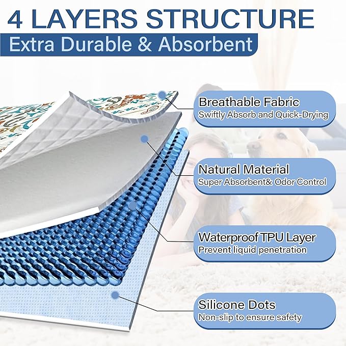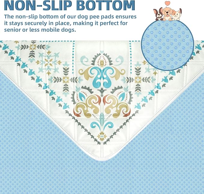 - 🐕Leak-proof Urine & Waterproof: Our washable dog pee pads feature a soft fabric that absorbs a significant amount of urine efficiently, meanwhile prevent odors and maintain a fresh-smelling in home. The high-quality waterproof TPU material guarantees urine not penetrate beyond the washable puppy pads, providing peace of mind and protecting your wood floors and carpets from accidents and mess. The reusable pee pads have exquisite patterns to add stylishly while protecting floors and furniture.