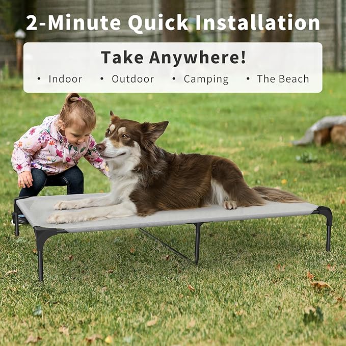 - 🐶【Tool-free Installation】Collapsible dog cot is easy to assemble and disassemble, no screws and wrenches needed. Detachable cover for easy cleaning at any time. Lightweight and portable. Perfect for indoor, outdoor, picnic, camping, training. Quality sleep on the go!