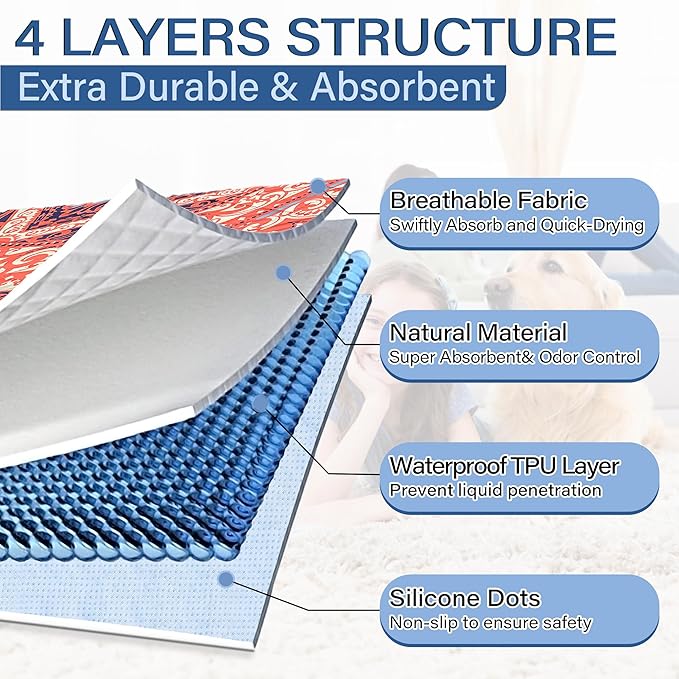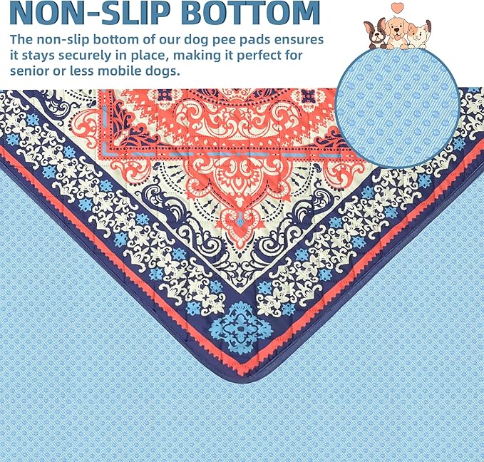 - 🐕Leak-proof Urine & Waterproof: Our washable dog pee pads feature a soft fabric that absorbs a significant amount of urine efficiently, meanwhile prevent odors and maintain a fresh-smelling in home. The high-quality waterproof TPU material guarantees urine not penetrate beyond the washable puppy pads, providing peace of mind and protecting your wood floors and carpets from accidents and mess. The reusable pee pads have exquisite patterns to add stylishly while protecting floors and furniture.