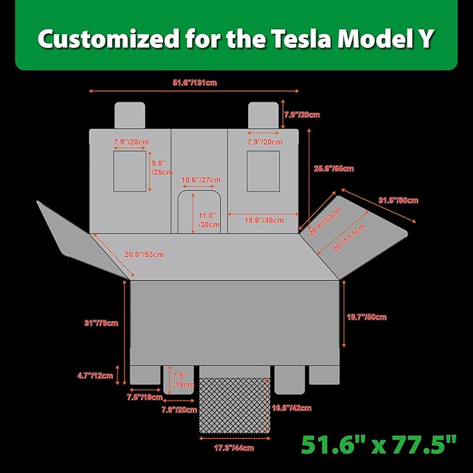 - Customed Size: Standard size: 51.6" W x 77.5" L, this dog backseat cover is specifically designed for the Tesla Model Y, it will fit perfectly into your car, we also designed a trunk mesh pocket, you can store some daily items. The 2 extra storage pockets on the front can store pet supplies, which is very convenient.