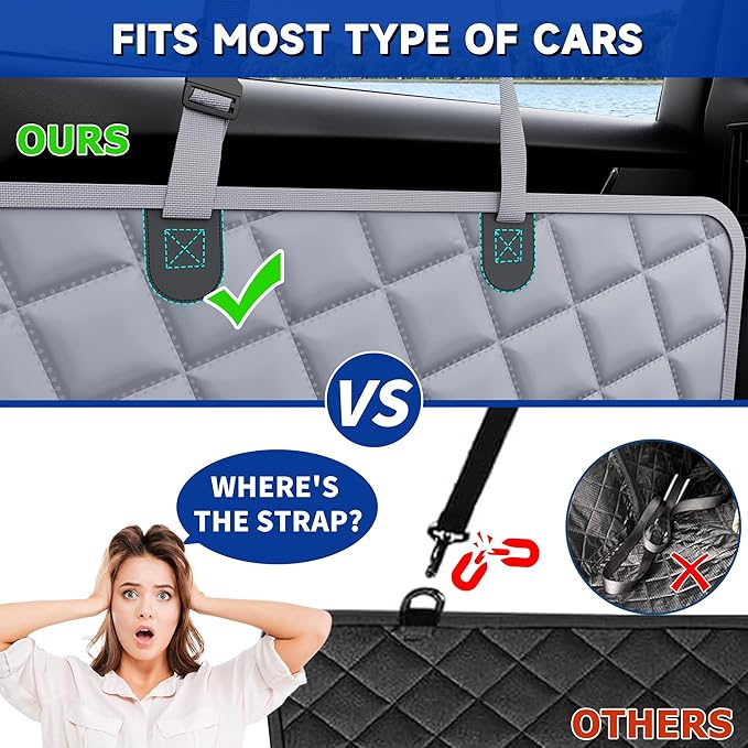 - EXCELLENT SIZE : 54" W x 58” L (Maximum open size) --Backseat cover for dogs fits to different vehicles like STANDARD cars, trucks, SUVs, including baby car seats.Setting up our travel dog back seat cover is a breeze thanks to its straightforward structure. It only takes seconds to install the dog car covers for backseat. Just snap the buckle straps around your car’s headrests and tuck in the seat anchors. you can customize the cover to your needs and preferences. Hit the road with ease and confidence.
