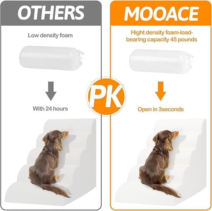 - Open Immediately Foam: The foam of this dog ramps don't need to waiting 24 hours or 48 hours like other dog stairs, when you open the vacuum packed bag the foam will opens immediately, we use 30 kg per cubic meter of high density(30D)foam, can withstand the weight of 45 lbs, high quality to stay with your dog or pet for a long time.