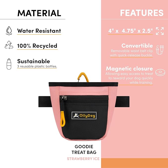 - FEATURES: The Goodie Treat Bag includes a removable waist-belt with a quick-release buckle attachment; or remove the waist-belt and simply hook your goodie bag on any leash or pack for hands free training and quick access to treats. This lightweight bag has a magnetic closure allowing easy access to treat to reward your dog quickly while training