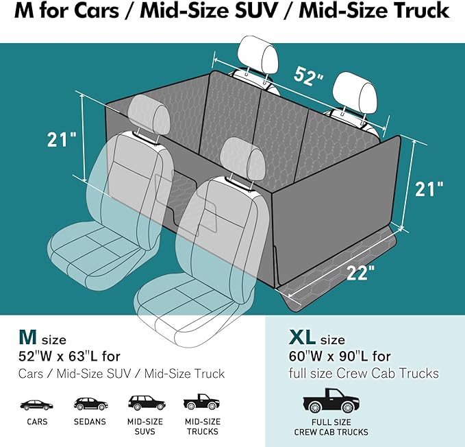 - 【𝐌𝐞𝐝𝐢𝐮𝐦 𝐃𝐨𝐠 𝐇𝐚𝐦𝐦𝐨𝐜𝐤 𝐟𝐨𝐫 𝐂𝐨𝐦𝐟𝐨𝐫𝐭】Designed specifically for Sedans/Cars/Mid-Size SUV /Mid-Size Truck, our Medium dog hammock provides a comfortable and secure travel solution. Your furry companion can join you on any adventure, while the strong material of the full rear cover ensures their comfort during long travels and memorable road trips.And comfortably and with your seats protected