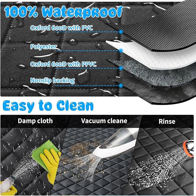 - Waterproof & Easy to Use: Made of 4-layer durable materials like 600D Oxford, the dog seat cover is waterproof, and scratch-resistant to protect your car from spills, scratches, and dirt. It is easy to install or remove the dog back seat cover, and easy to clean with a damp cloth or vacuum. It's a must-have accessory for any pet owner on the go.
