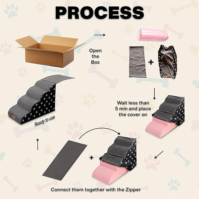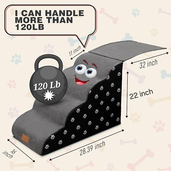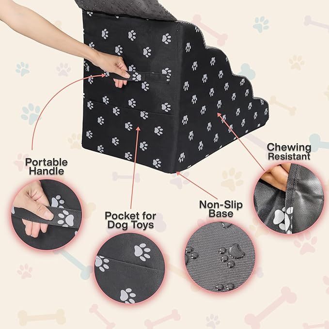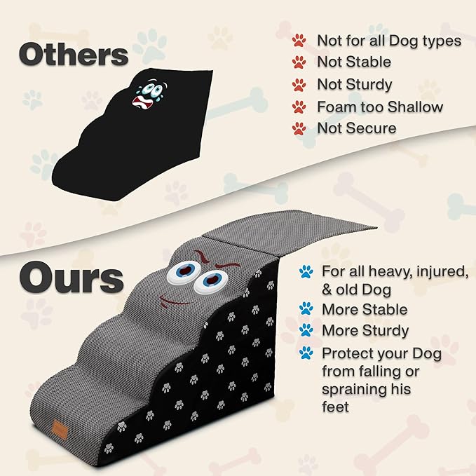 - -🐩 SAVE MONEY: You will never have to buy another stairs for your lovely pet again, we will tell you why: 1-Durable material (foam and cover are not cheaply made ). 2-More sturdy and stable and keeps your pet legs balanced when on the stairs. 3- The steps are not narrow, has enough space to go up and down easily. 4- Very safe for every heavy/elderly dog even children. 5-Anti-chew/spread material (we chose hard-cover material which makes it difficult to chew or damage the edges).