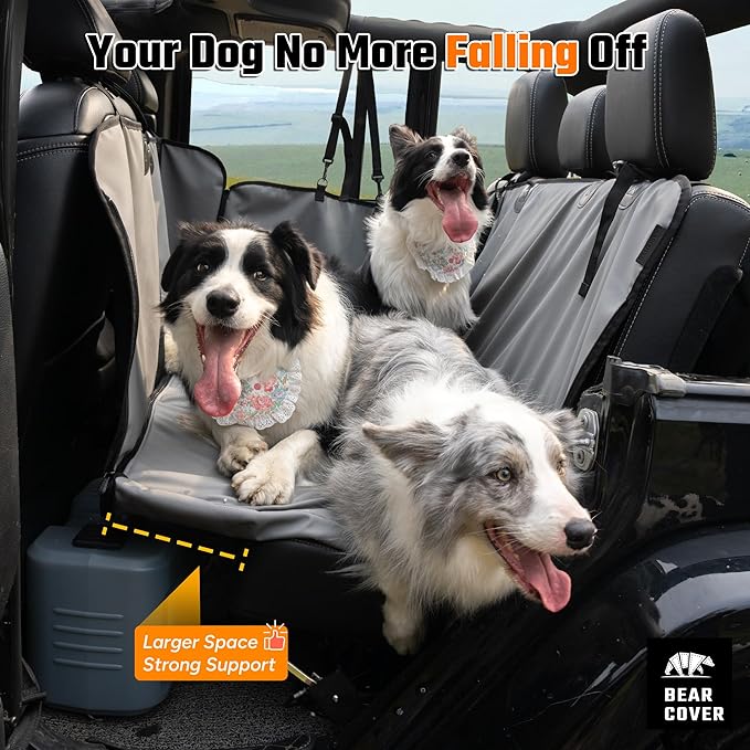 - 【Back seat into car bed】We have not only increased the hard board support but also upgraded and optimized the back seat cover for dogs.We’ve strengthened the back seat extender,reinforced the dog car seat cover in areas prone to wire breakage and peeling,and increased the dog car seat cover for back seat’s durability and weight capacity by 40%.BearCover Dog Hammock gives your large dog a spacious and stable travel experience.For more details,watch the video on the details page.