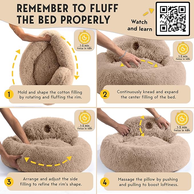 - 【Easing Dog Anxiety】- Our donut dog bed design is perfect for pets who love to curl up. Featuring an 8’’ raised rim, our pet bed provides optimal support, creating a secure environment. The round shape, mimicking a pet mom’s embrace, alleviates muscle and joint pain, making it ideal for cuddling and burrowing. Made with high-quality, pet-safe materials, it forms a warm, fluffy, calming space that is anti-anxiety and promotes deep, restful sleep.