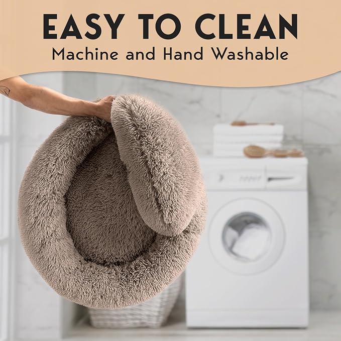 - 【Easing Dog Anxiety】- Our donut dog bed design is perfect for pets who love to curl up. Featuring an 8’’ raised rim, our pet bed provides optimal support, creating a secure environment. The round shape, mimicking a pet mom’s embrace, alleviates muscle and joint pain, making it ideal for cuddling and burrowing. Made with high-quality, pet-safe materials, it forms a warm, fluffy, calming space that is anti-anxiety and promotes deep, restful sleep.