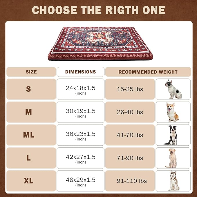 - MULTI-PURPOSE DOG MAT: This durable dog crate mat size: S-18" x 24"; M-19" x 30"; ML-23" x 36"; L-27" x 42"; XL-29" x 48". Suitable for small, medium and large dogs or cats. It can be used as a dog pad, dog pillow, kennel mat, cage mat, dog crate mat, or even a dog travel pad in your car or truck.