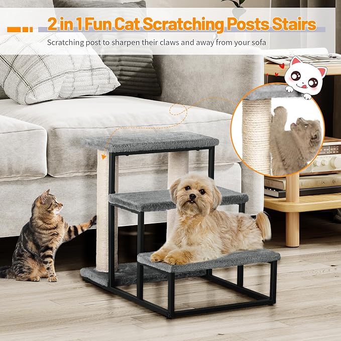 - 【For Both Small Dogs & Cats】: With the help of this step, your pet can easily climb up and down to beds, sofas, chairs, balconies, and anywhere else they want to go. The iron frame serves as the overall support, ensuring its load-bearing capacity and stability. The back are equipped with scratching posts to satisfy cats' natural urge to scratch, thereby protecting your furniture from damage.