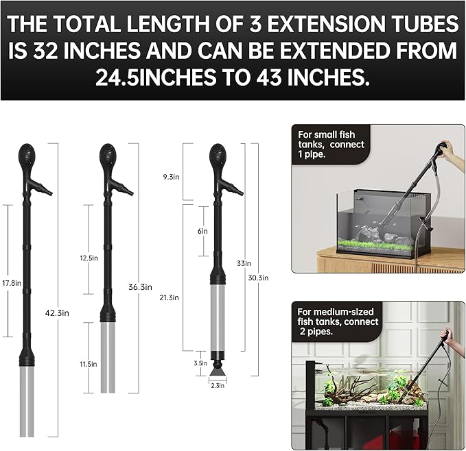 - Wide range of applications: Equipped with 3 extension tubes, it can be extended from 24.5 inches to 43 inches, suitable for medium and large fish tanks.