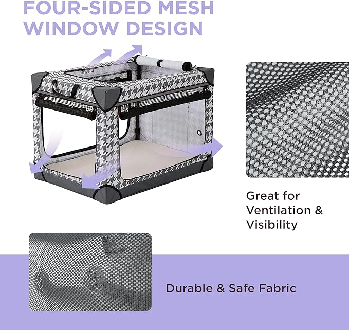 - Breathable & Comfortable: The four-side zippered breathable mesh walls ensure optimal ventilation, providing a comfortable environment for your furry friend. The soft plush mat inside the crate offers a cozy and comfortable space for them to relax and unwind.