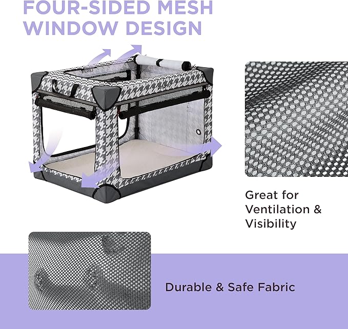 - Breathable & Comfortable: The four-side zippered breathable mesh walls ensure optimal ventilation, providing a comfortable environment for your furry friend. The soft plush mat inside the crate offers a cozy and comfortable space for them to relax and unwind.