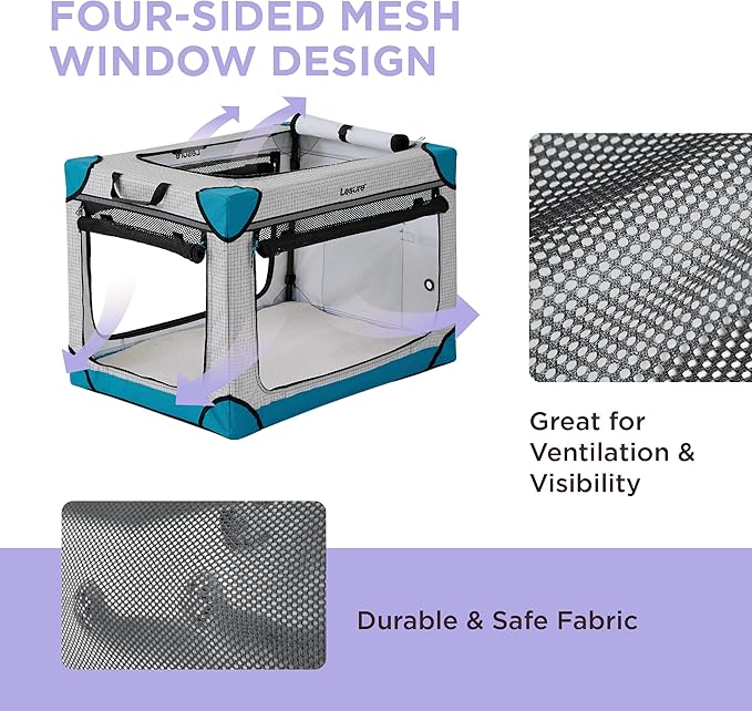 - Enhanced Safety: With a heavy-duty iron frame, this crate maintains its shape and ensures durability. Reflective strips on both sides enhance visibility, keeping your pet safe and visible. The crate is equipped with self-locking zippers, preventing your pet from escaping, while high-density durable mesh adds an extra layer of security. Additionally, an built-in leash further reinforces your pet's safety.