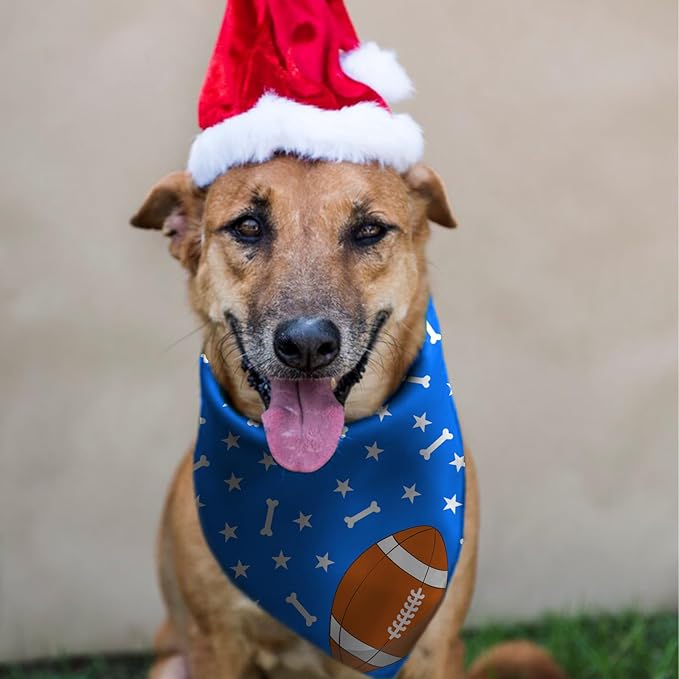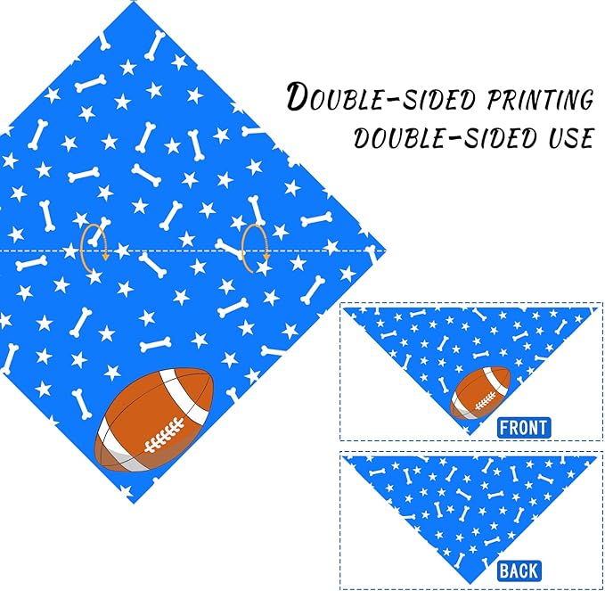 - [ FOOTBALL DESIGN ]:The main color of the pet bandana is blue.They are designed in football patterns.And it has stars and bones on it.Sport elements and dog favorite things make your dog's birthday full of joy.