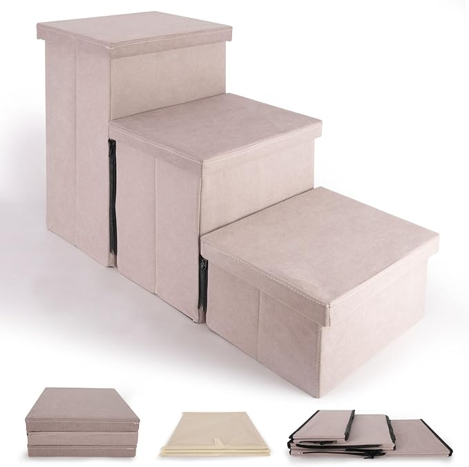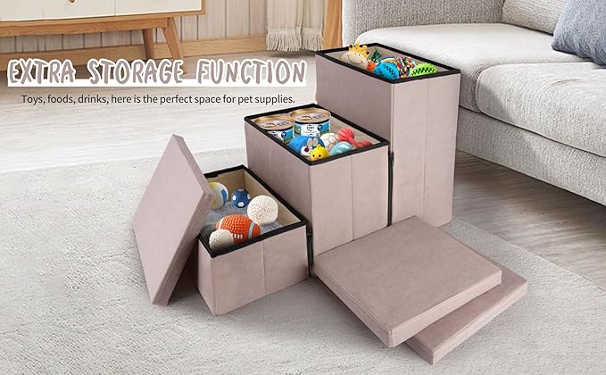 - 【2-IN-1 Dog Stairs】These folding pet steps are not only pet stairs for high beds, but also a storage box for dogs' or cats' items. With 3 large-capacity storage spaces under the dog and cat steps, you can easily store dog clothes, leashes, toys, food, blankets, nursing tools, and other pet accessories.