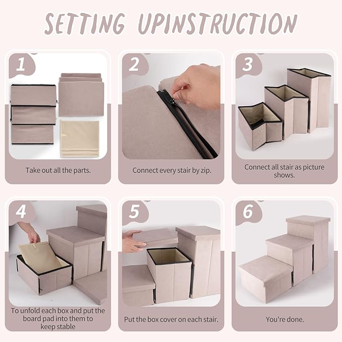 - 【Easy to Assemble and Carry】The dog bed stairs can be installed in 4 easy steps. After receiving the product, open the package to unfold the stairs, insert the non-slip bottom cushion, use the zipper to link the steps together, and then add the cover. You will have a sturdy set of dog stairs. The pet steps fold flat, allowing for easy storage under your couch or bed.