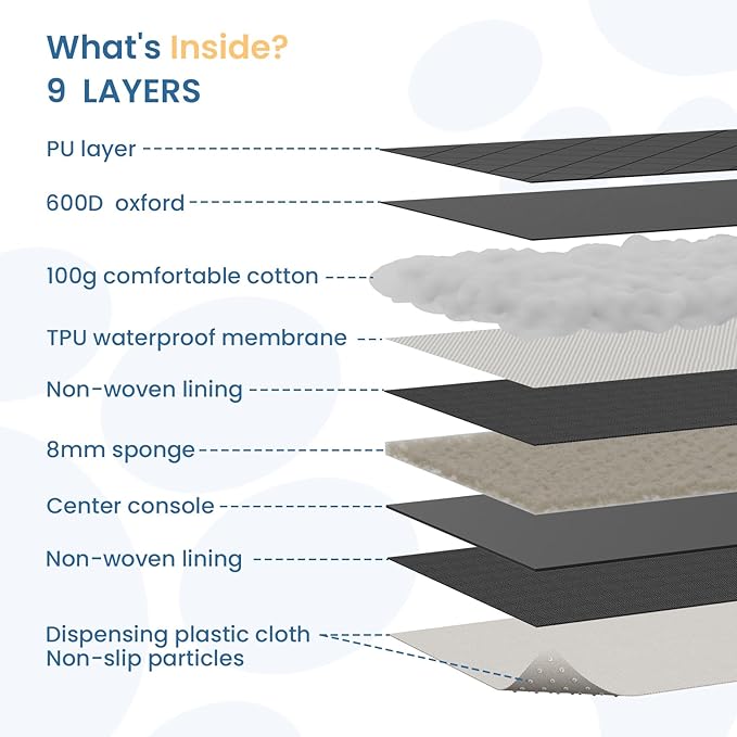 - High Quality Fabric: The PU coating layer is the first waterproof layer, and paired with 600D Oxford fabric, using advanced heat pressing technology, softer and odorless than other PVC layers. And Paired with TPU waterproof layer, three waterproof layer better than other one layer waterproof layer.It provides the ultimate protection for your dog car seat from scratches, dirt, wet mud paws and dog hair. Cleaning is easy, just wipe with a damp cloth or use a vacuum to remove any stains or debris to ensure your car is spotless. Non-slip dotted rubber on the bottom makes the dog cover more secure and prevents your dog from slipping.