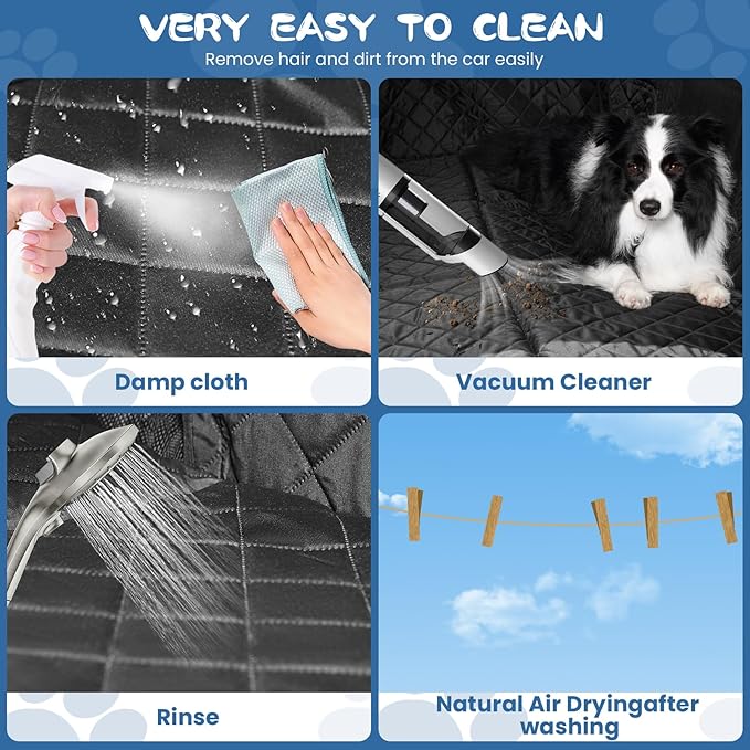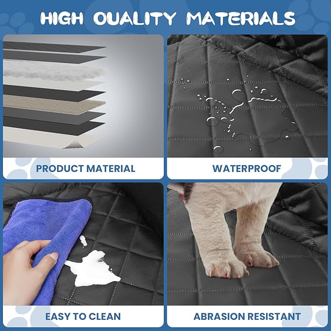 - High Quality Fabric: The PU coating layer is the first waterproof layer, and paired with 600D Oxford fabric, using advanced heat pressing technology, softer and odorless than other PVC layers. And Paired with TPU waterproof layer, three waterproof layer better than other one layer waterproof layer.It provides the ultimate protection for your dog car seat from scratches, dirt, wet mud paws and dog hair. Cleaning is easy, just wipe with a damp cloth or use a vacuum to remove any stains or debris to ensure your car is spotless. Non-slip dotted rubber on the bottom makes the dog cover more secure and prevents your dog from slipping.