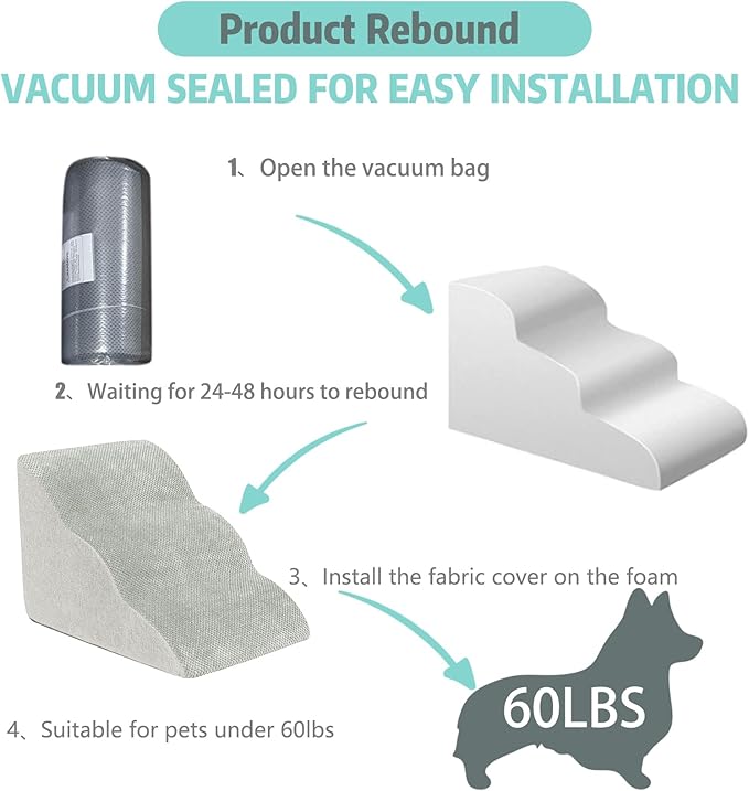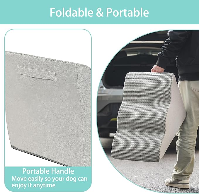 - CONVENIENT: These pet stairs include a convenient portable handle, making it easier to move around as needed. Please allow the foam 24-72 hours to fully expand after unpacking from its vacuum-sealed package to ensure the best comfort for your pet.