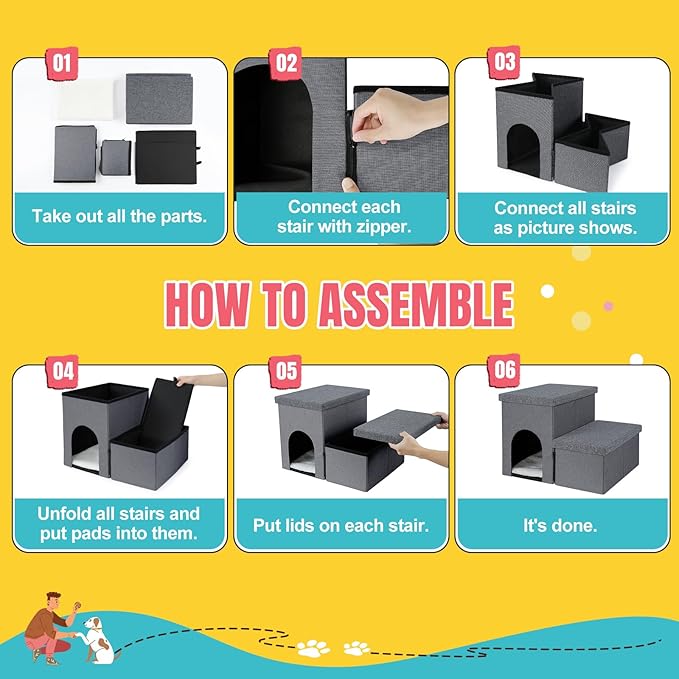 - PORTABLE&EASILY ASSEMBLE-Every two neighboring stairs are connected by the zipper shared with one another, put pads at the bottom of the stairs and then put lids over it. If you wanna pack pet steps for cats in the suitcase or store it, do it reversily in the order of assembly and it won't take you more than 5 minutes.