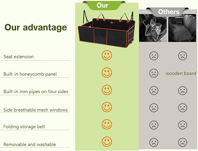 - 【Universal Size and Portable】 The dog car seat extender is universal, measuring 52*25in, perfect for cars, SUVs, and trucks. It comes with fixed straps for folding and storage, making it portable for outdoor trips! The bottom is consists of 4 high-strength honeycomb slats, wrapped in lining fabric, which can be easily to removed and washed.