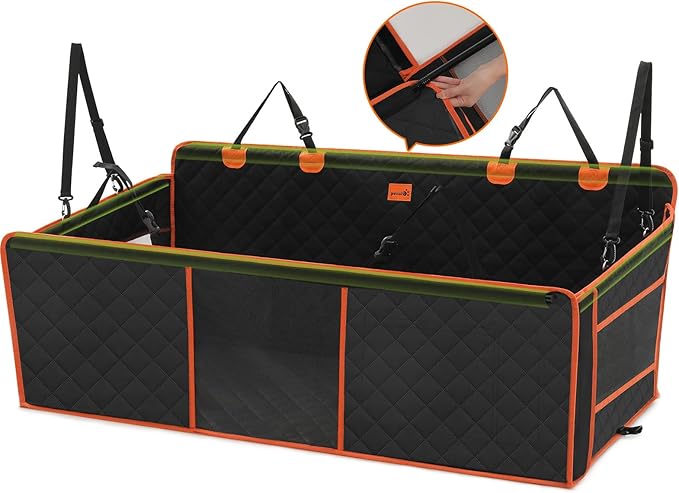 - 【Safe & Reliable Dog Travel Bed】This dog car seat cover provides all-round safety protection for your furry friend. 1. Safe Driving: 4 adjustable straps, 2 non-slip seat anchors and non-slip bottom ensure stability and prevent any movement during driving. 2. Dog seat belts provide additional restraint and protection. 3. Car Protection: Say goodbye to scratching the car door! The heightened and widened side wing trapezoidal design fits the car door better and provides comprehensive protection.