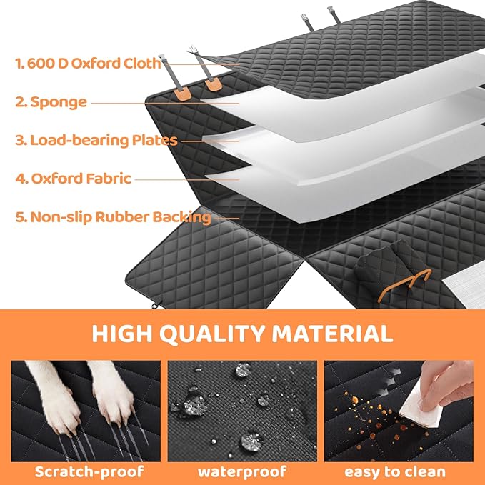 - 【FULLY PROTECTING】: The hard bottom dog car seat cover is made of 6 layers of thicker wear-resistant fabric and a high-density fiberboard, waterproof, tear-resistant and non-slip, easy to clean. It can completely cover your back seats and doors. Fully protecting your car from scratches, dirt.
